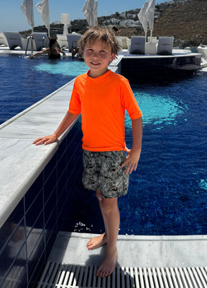 Our O for Orange short sleeve neon rashie from our Ollie collection is unashamedly bright and bold.