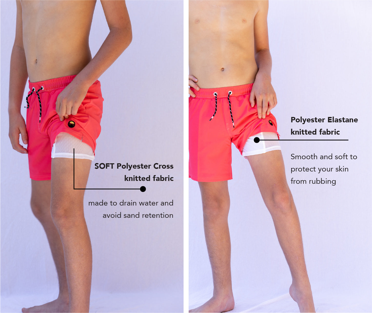 Our unique dual fabric in-built inner lining has a soft and smooth inside panel and an outside panel designed to drain water, avoid sand retention and prevent chafe.