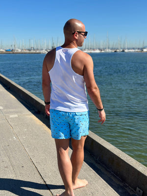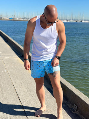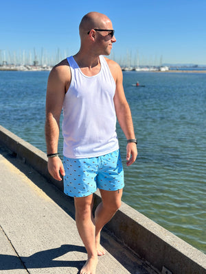 The Noosa Bush Turkey board short, with our signature one-of-a-kind turkey print, pops in Aqua Blue with a stylish & cool contrast black waistband.
