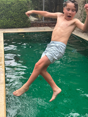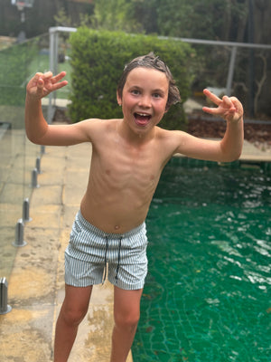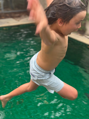The NEW Mykonos Stripe board short from our Tommy collection balances clean, coastal stripes with a refined palette, making it the perfect complementary piece to our bolder, brighter collection while still standing confidently on its own.