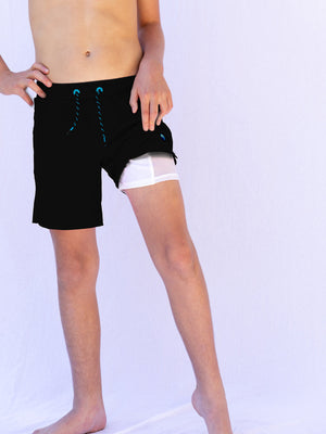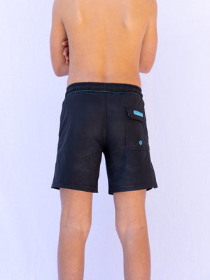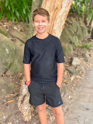 The Black Beauty board short from our Tommy collection is stylish and modern, yet timeless. Fluro blue trims add a cool touch ensuring these boardies don't look like just another pair of black shorts!
